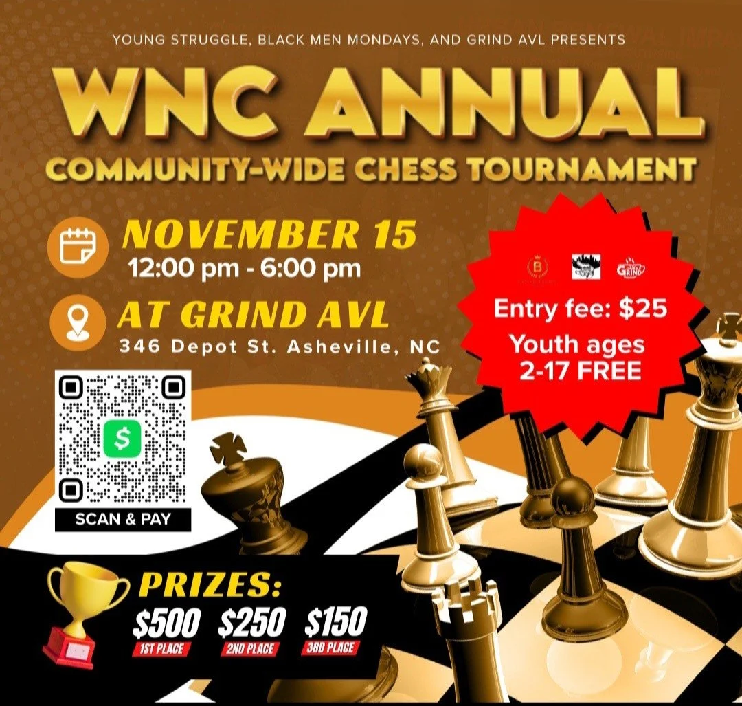 Saturday, November 15th, Grind AVL is hosting a chess tournament organized by Young Struggle and Black Men Mondays! The profits from the tournament will be put towards funding transportation for Asheville area youth, so that kids can attend and participate in local activities and events safely!